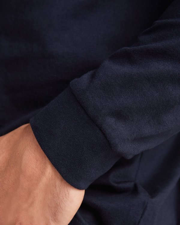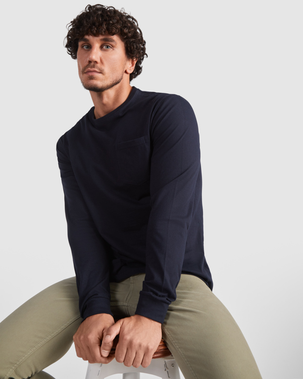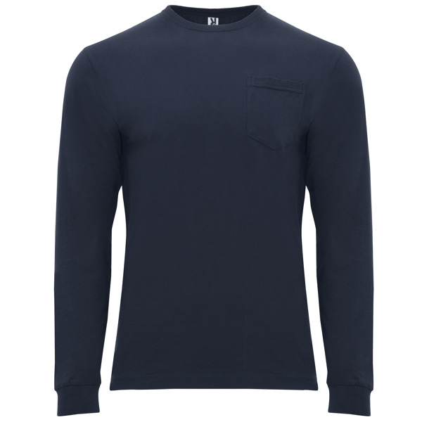 Camiseta de manga larga con cuello redondo y puños en canalé 1×1. Bolsillo en pecho izquierdo. Cubrecosturas reforzado en cuello y hombros. Disponible en tallas de la S a la 3XL en color Azul Marino. Material: 100% algodón, 165 g/m².